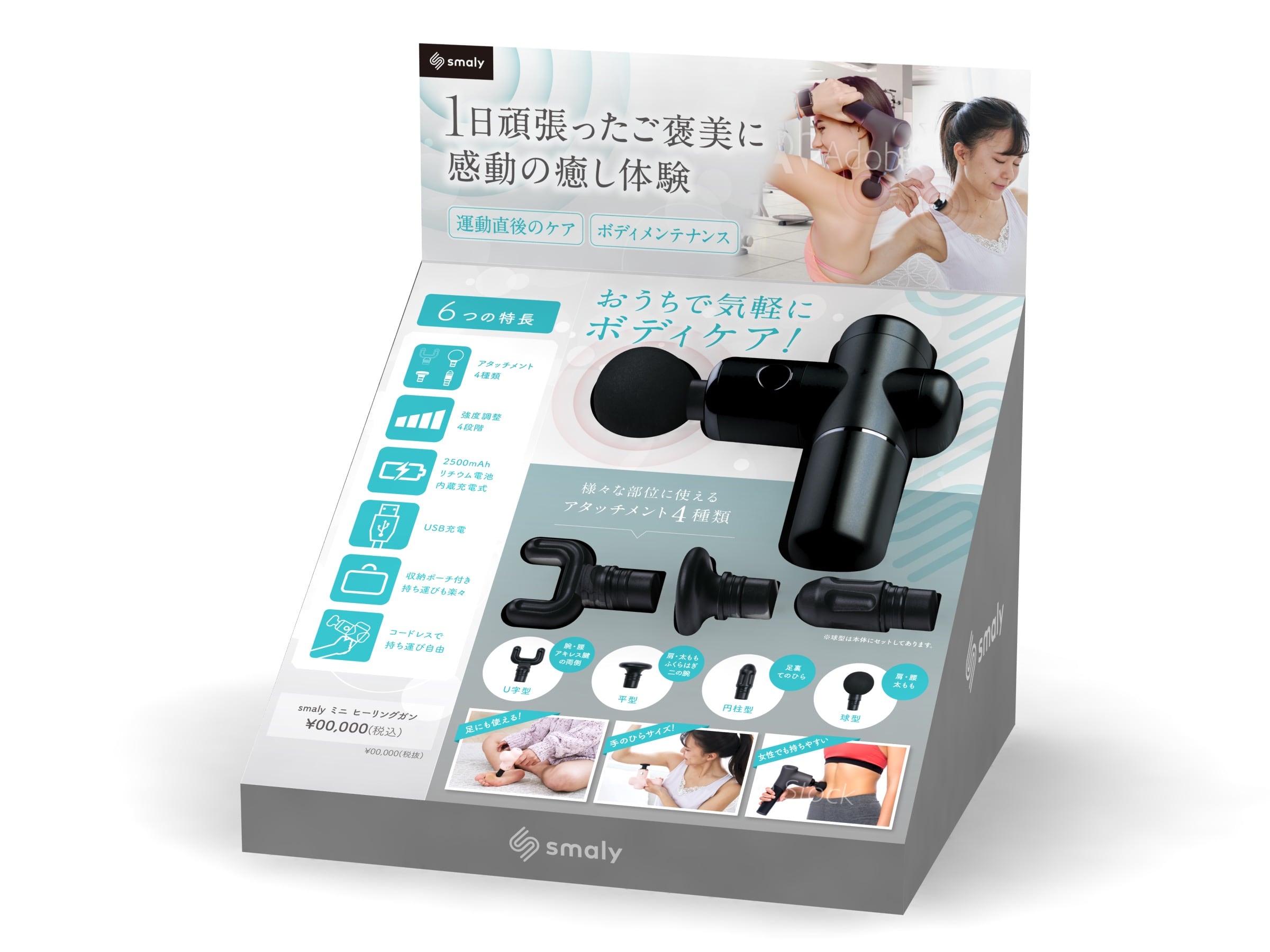 重さ385g(アタッチメントを除く)とコンパクトなのに強力な振動でマッサージ。手のひらサイズで女性でも持ちやすく、足裏を含めた全身のボディケアをこの1台がフルサポートします。また、筋膜リリースにも役立つ4種類のアタッチメント付きで、運動直後の身体のメンテナンスも可能です。