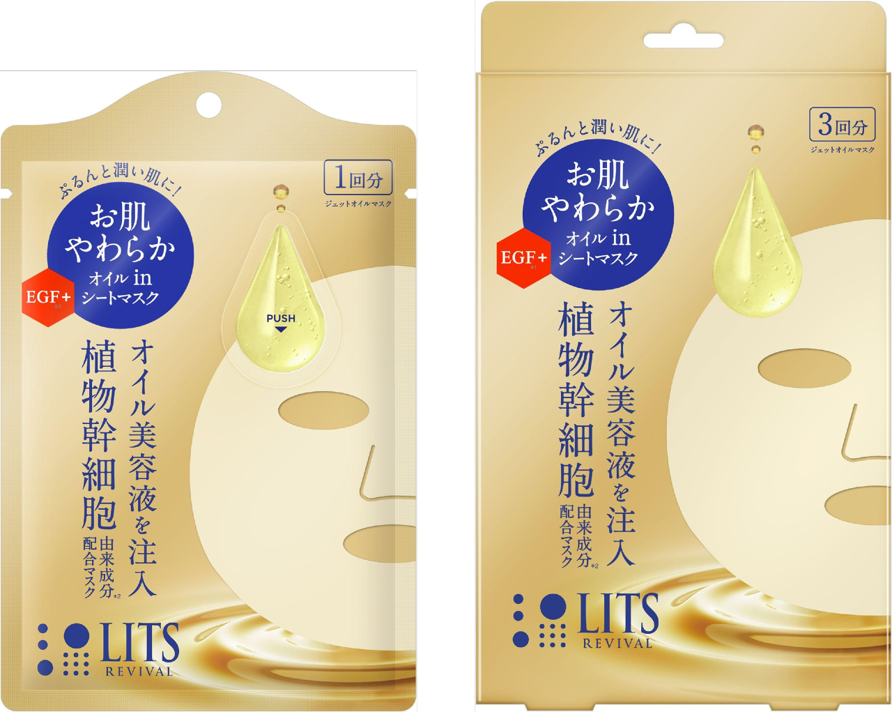シートマスクには3つの植物幹細胞由来成分とEGFを配合。さらにオイル美容液には、4種の天然由来オイルとオリーブ由来の幹細胞エキスが配合されており、シートマスクと分かれたカプセルに入っている。使用直前にカプセルをプッシュしてシートの中でミックスする。