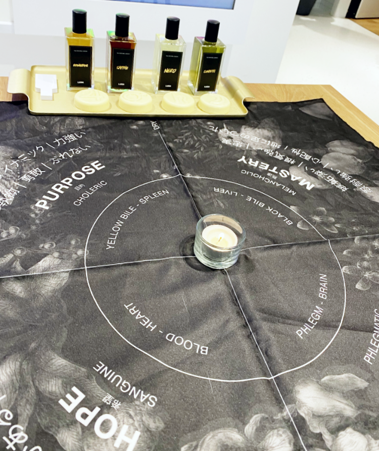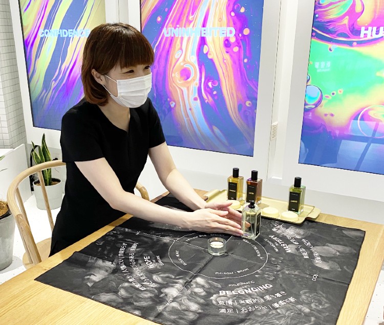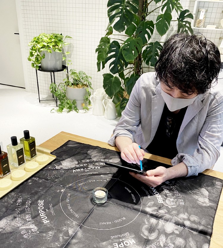 こちらは香りを選ぶためのコンサルテーションに使うもの。ルネサンス用に作られたそれぞれの気質とそれに対応した単語が書かれてあるKnot Wrap(ラッシュオリジナルのデザインで展開する風呂敷アイテムの商品名)で、自分の状態とその裏側にあるものや香りとの関係を知ることができます。ただ香りや状態をカウンセリングするだけでなく、こういったツールがあると「サロンに行ってみよう」というタイミングが変わってくるのでは