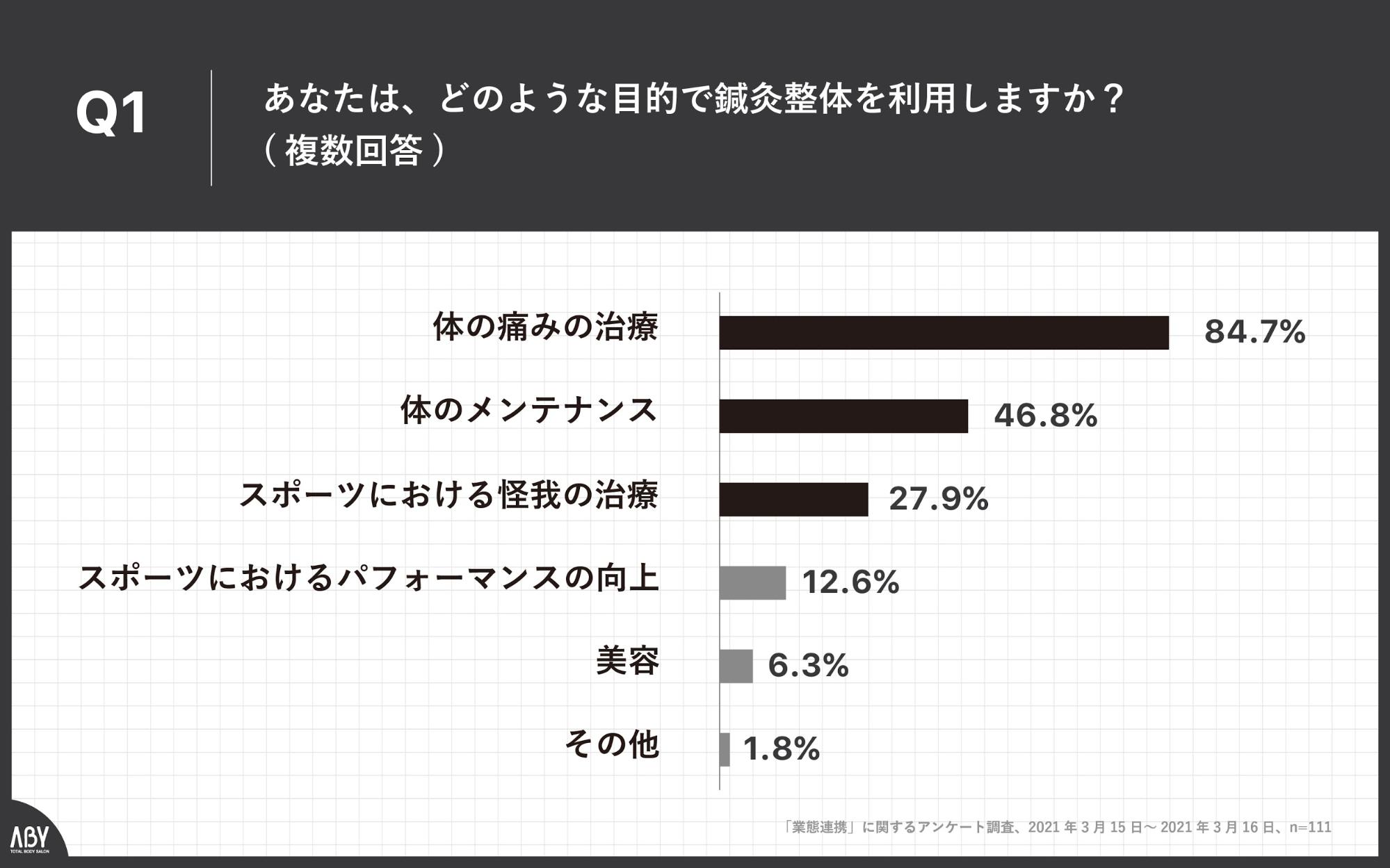 Q1.あなたは、どのような目的で鍼灸整体を利用しますか?(複数回答)」(n=111)