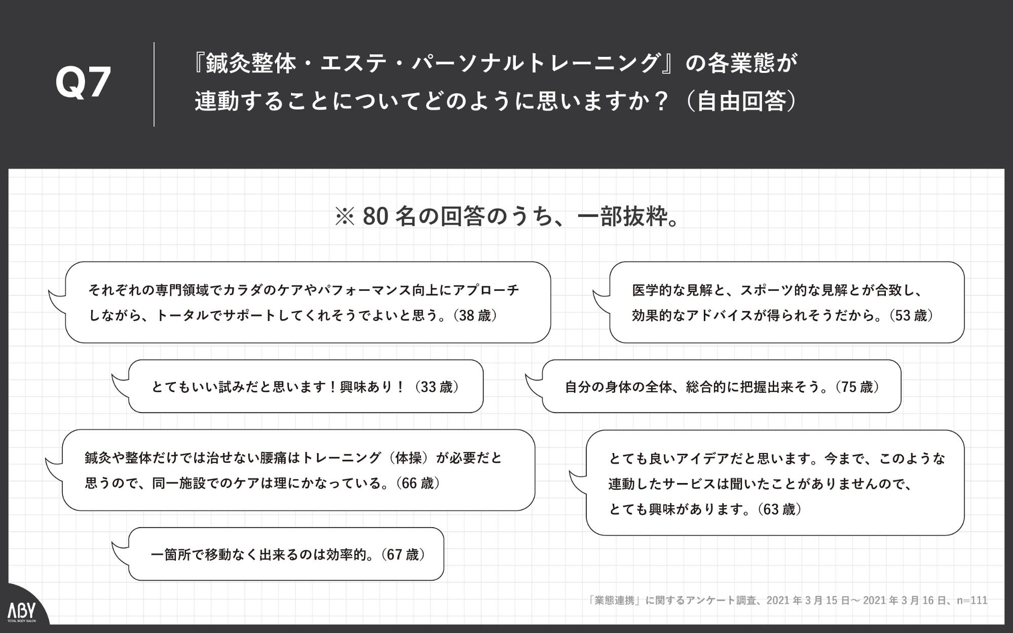 Q7.鍼灸整体・エステ・パーソナルトレーニング』の各業態が連動することについてどのように思いますか?(自由回答)(n=111)
