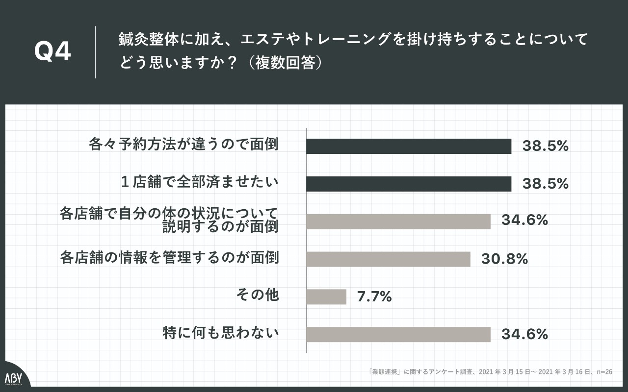 Q4.鍼灸整体に加え、エステやトレーニングを掛け持ちすることについてどう思いますか?(複数回答)