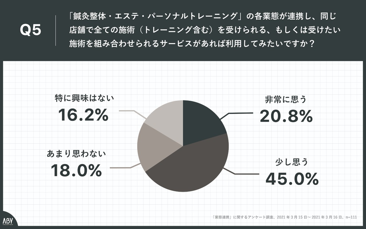 エステ・パーソナルトレーニング・鍼灸整体のスペシャリストが集まるTOTAL BODY SALON「ABY」を運営する株式会社ABY(本社:東京都目黒区 )は、関東在住で鍼灸整体を普段から利用している経営者111名を対象に、「業態連携」に関するアンケート調査結果がとても興味深いのでご紹介します。