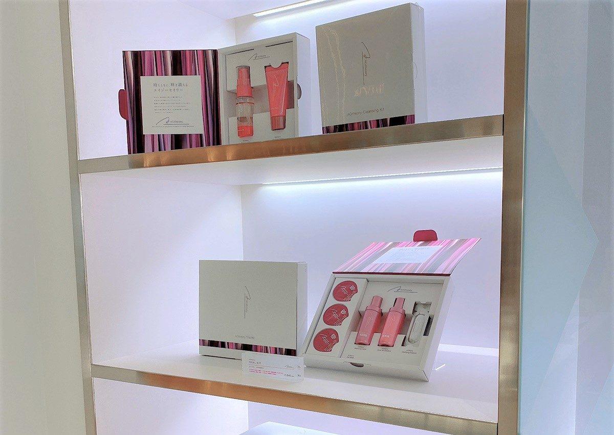 AGtheoryコーナー。上段がクレンジングと洗顔がセットされたミニキット。下は、ジェル マスクやクラリファイング エッセンスなどスキンケアが一通り試せるキット。