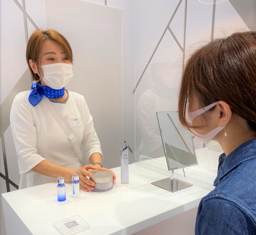 化粧品カウンターですから、もちろんBA(美容部員)もいます。店頭で直接のカウンセリングはもちろん、オンラインでも実施する予定だそう。ニューノーマルの化粧品カウンターは進化していますね。これはサロンも負けていられないですよ。