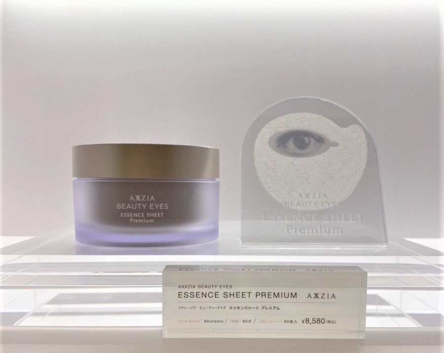 ビューティーアイズ エッセンスシート プレミアム 60シート入、美容液含有量85mL、8,580円(税込) 目まわりの形状に即した全方位型の「アイラウンドシート(アクシージアオリジナルシートの形状)」を採用。皮膚が薄く、 ハリの低下を感じやすい上まぶたから頬の三角ゾーンまでカバーできる新形状の シートで、ワンアクションで目まわり全体のケアが可能。 高密着で液だれしにくい0.3mmの極薄シートが、細かな凹凸のある目もとにも ぴたりとフィットする