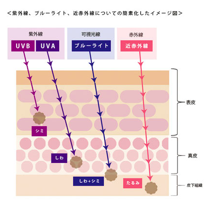 可視光線の一種。紫外線に近い波長のブルーライトは、網膜に届く可視光線の中でも強いエネルギーを持っており、目に影響を与えるだけでなく、UV-Bよりも真皮層の深い部分にまで到達する。「第三の紫外線」と呼ばれる。スマートフォンやパソコンのモニター、LED照明などに多く含まれている。