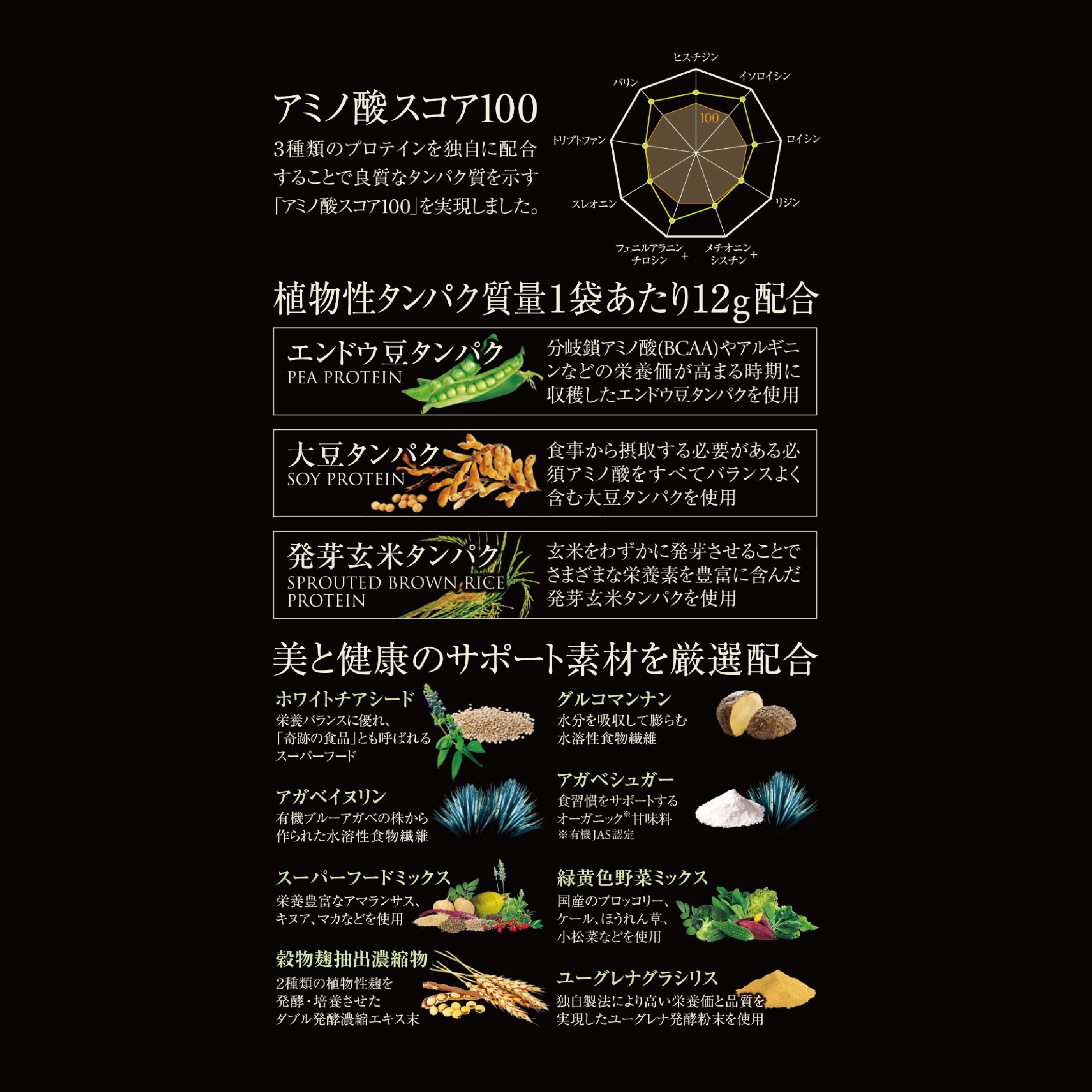 この3種が選ばれた理由は、アミノ酸スコア 100を目指したため。アミノ酸スコアとは、食べ物に含まれる「タンパク質」の量と「必須アミノ酸」がバランス良く含まれているかを表す数字指標。必須アミノ酸の数値が100に達していれば質の良いタンパク質であると言える。『プロテインナチュラ グランプロ』は、1回分(1袋)で植物性タンパク質を12g以上配合。手軽に良質なタンパク質を摂取することができるツールと言えそうだ。
