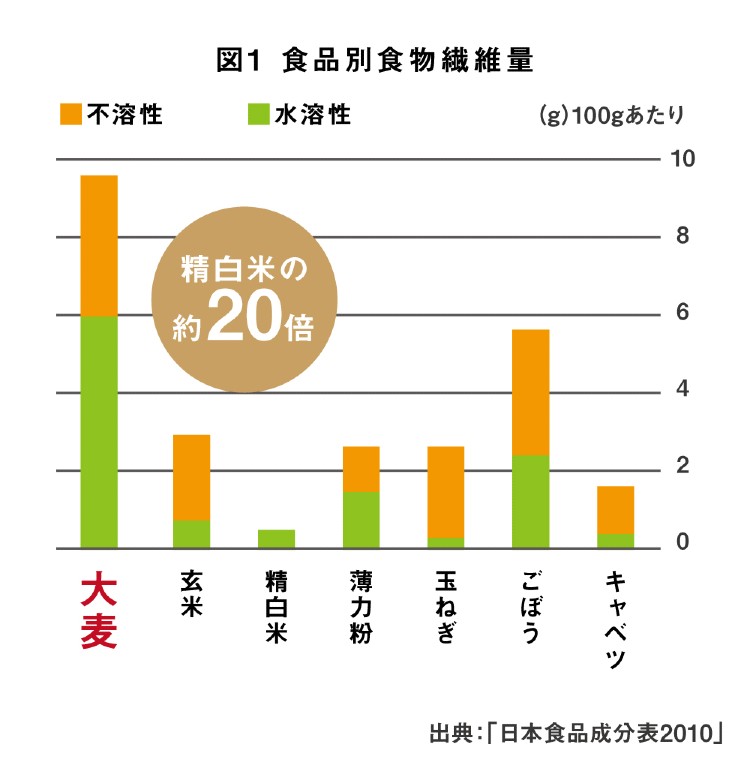 糖質制限ダイエットが流行しているが、穀物は野菜や果物よりはるかに食物繊維量が多いのも事実。その中でも特に大麦は他の穀物に比べて健康効果の高い水溶性食物繊維(大麦由来β-グルカン)を豊富に含んでいる。β-グルカンは食べたものをゼリー状に包んで胃から腸へ移動するため、消化吸収に時間がかかり、血糖値の急上昇を防ぐことができる。また、食後に分泌されるインスリンは糖をエネルギーとして消費させるが、全てを消費できない場合は脂肪として体内に蓄積されることになる。