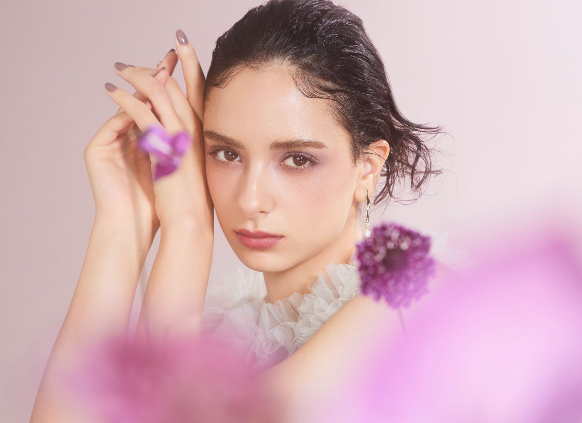 限定色「SR14(クラッシィブラウン)」は、春夏のトレンドであるグレイッシュなトーンをまとった儚げな大人ブラウンパレット。使いやすいモーヴカラーで上品な印象を演出しつつ、アクセントとして左下のまろやかなピンクベージュをプラスすることで、春らしい透明感を感じられる配色。落ち着いた青みカラーでワンランク上の洗練された目元に。