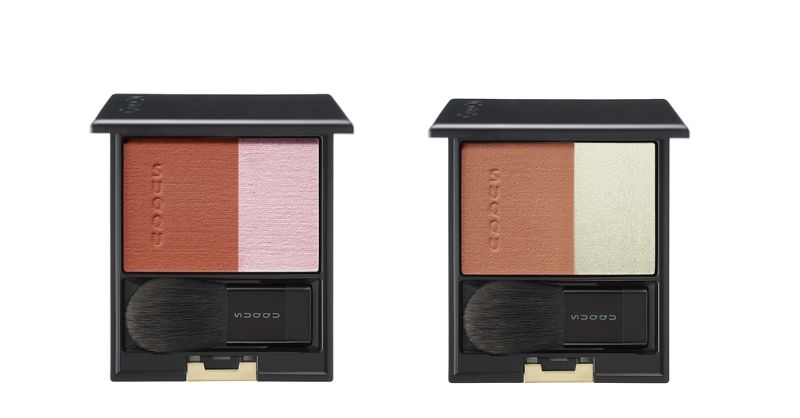 高発色なマットな質感のチークとふんだんにパールを配合したハイライトがセットされたブラッシュ限定2種が登場。単色ずつで使用しても、2色をブレンドさせても。