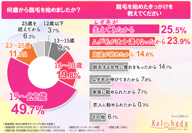 定期的な脱毛をはじめた年齢は、19歳から22歳が約半数を占める結果となった。高校を卒業して大学や専門学校に進学したタイミングだ。
