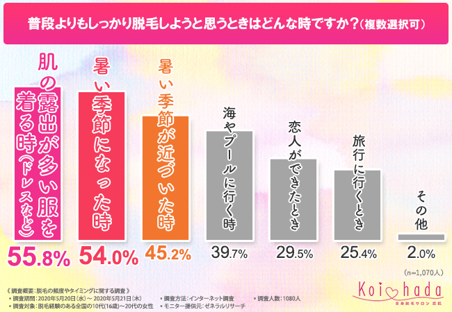 また、「普段よりもしっかり脱毛したいと思うのはどんな時か(複数回答可)」という質問には「肌の露出が多いドレスなどの服を着る機会がある時という回答が55.8%でトップ。