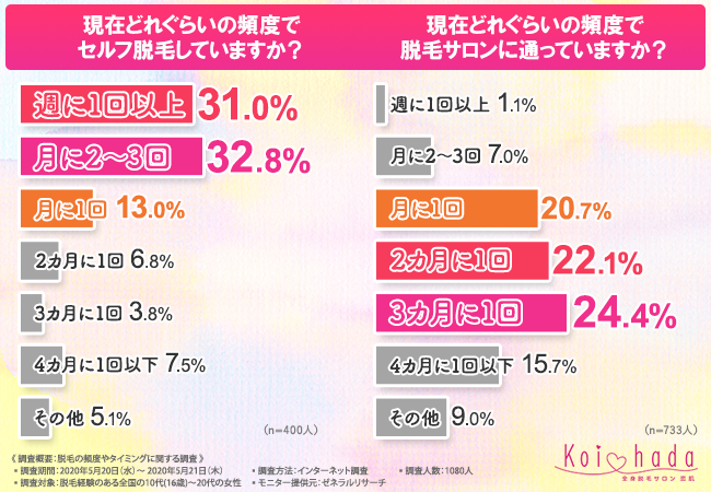 「現在どれぐらいの頻度でセルフ脱毛していますか?」と質問の上位回答は、月に2~3回の32.8%、週に1回以上の31.0%がランクイン。平均すると最低でも月に約4回は自分で脱毛しているということに。