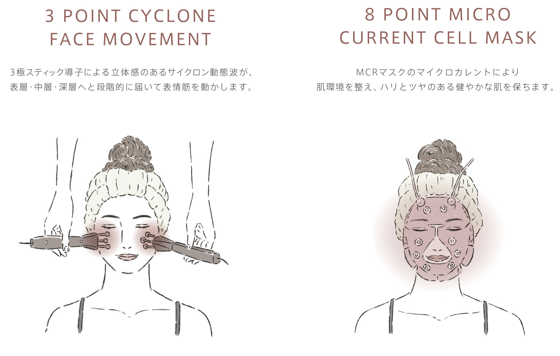 2つのプロープを使い、表層、中層、深層の表情筋をまんべんなく動かしてから、マイクロカレントで肌のコンディショニングをきめ細やかにケア。前半のケアではうねるような体感が「表情筋にアプローチしてる」と実感しやすいところもポイント。