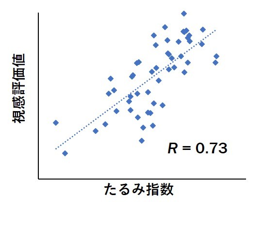 座った時と寝転んだ時の顔の状態変化を比べて、たるみの正体を導き出していくということのようです。そして当然、「たるみ指数」は見た目年齢を表す「たるみスコア(視感評価値)」と相関性が非常に高く、「あ、そう言われてみれば納得!」な結果をグラフで見ることができます。