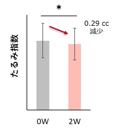「たるみ」に効果のある「赤松抽出液」「十薬抽出液」を配合した試作品に、今回新たに考案した独自の使用ステップやセルフマッサージを加えた美容法を組み合わせました。その結果、連用前後で有意に「たるみ指数」が減少したことから、わずか2週間の期間における「たるみ」の改善を評価できることが確認できました。また、今回検出された有意な「たるみ指数」の約0.29cc分の減少は、およそ2歳分の「たるみ」が改善したことを意味しています。さらに各被験者個人の「たるみ指数」から、参加した被験者のうち55%の人で、明らかに「たるみ」が改善していることも確認しました。今回開発した評価法は、言語や皮膚色に影響されることがないことから、世界中のお客さまに向けて、客観的に「たるみ」改善の評価を行うことができます。