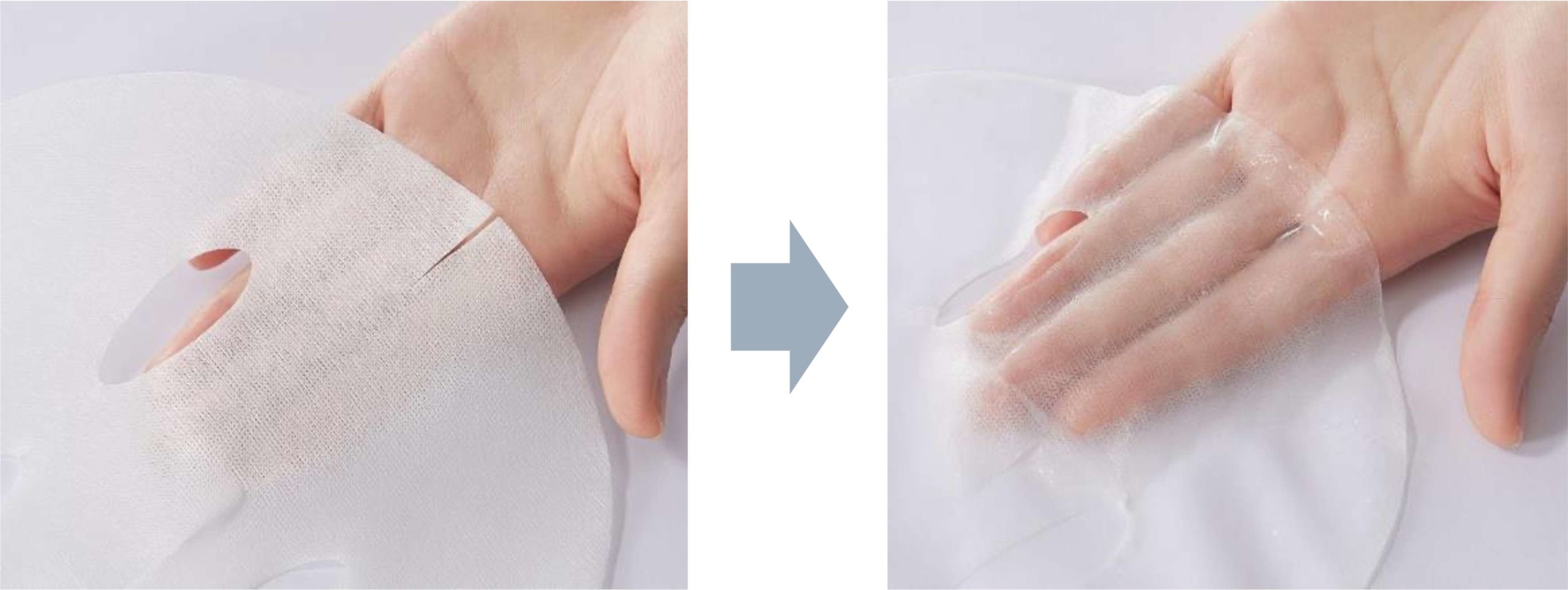 冷凍乾燥されているため、シートは美容液に浸かっていないので、まずは「解凍」する必要があるのが特徴。袋を開封し、マスクの入ったトレーを取り出して水25mLを入れる。ここでマスク全体に水を含ませる(これが「解凍」)。 十分に水分を含んだマスクを取り出して広げ、最初に目の位置、次に口の位置にマスクを合わせてから顔全体に密着。ここからは通常のシートマスクと使用方法は同じ。10〜15分後に角質や皮脂が気になる部分をマスクを折りたたんでふき取る。肌に残った液を手のひらでなじませる。